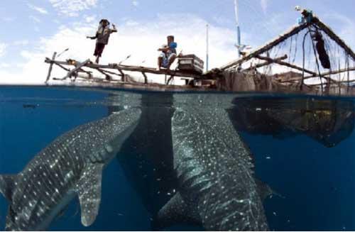 虽然未被邀请,但在印尼西巴布亚省的鲸鲨们还是不请自来,偷偷吃“免费的午餐”从渔网破洞中享用小鱼。水下摄影师斯蒂夫琼斯用镜头记录了鲸鲨享用“自助餐”的情形。琼斯介绍道:“鲸鲨被当地渔民捕鱼的渔网诱惑,而这些渔网大多有破洞。因此刚好给鲸鲨提供了一个"免费午餐"的机会。它们会用嘴将这些小鱼从破洞中吸出来好好享受一番。”